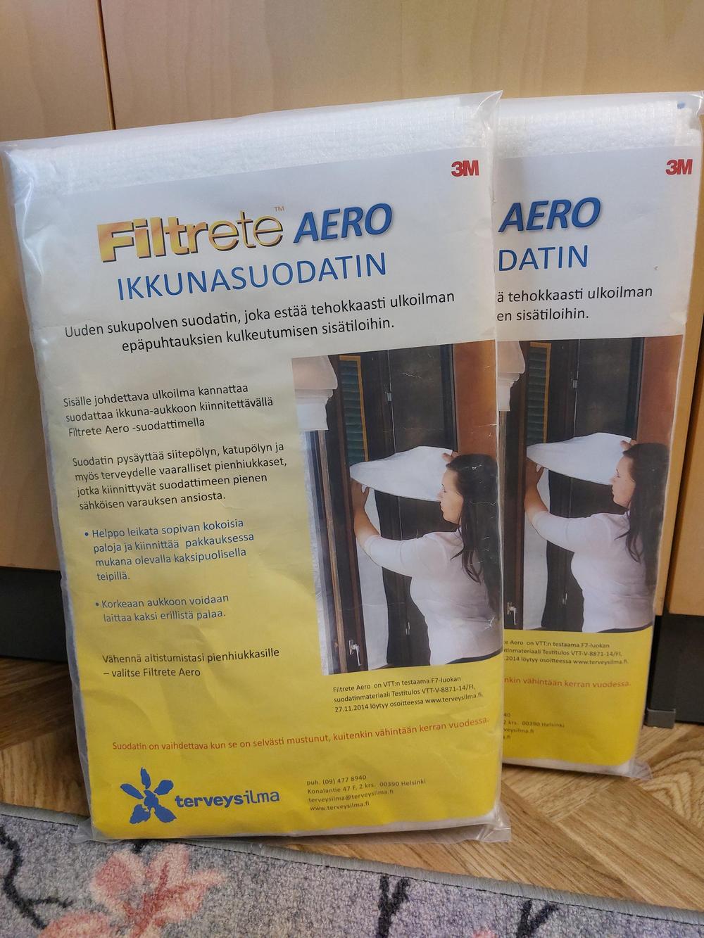Filtrete Aero -ikkunasuodatin pysäyttää siitepölyn, katupölyn ja myös terveydelle vaaralliset pienhiukkaset, jotka kiinnittyvät suodattimeen pienen sähköisen varauksen ansiosta. Suositellaan vaihdettavaksi vähintään kerran vuodessa.